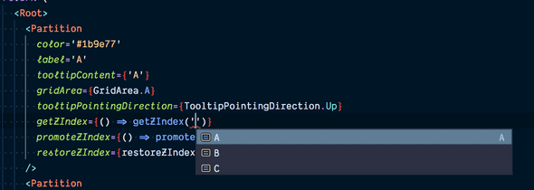 1// https://github.com/huy-nguyen/z-index-management/blob/problem-simple-solution/src/Partition.tsx2const Partition = (props: Props) => {3 const [isTooltipShown, setIsTooltipShown] = useState<boolean>(false);4 const onMouseEnter = () => {5 promoteZIndex();6 setIsTooltipShown(true);7 }8 const onMouseLeave = () => {9 setIsTooltipShown(false);10 restoreZIndex();11 }12 return (13 <Root14 css={css`15 background-color: ${color};16 grid-area: ${gridArea};17 z-index: ${getZIndex()};18 `}19 onMouseEnter={onMouseEnter}20 onMouseLeave={onMouseLeave}21 >22 {tooltip}23 {label}24 </Root>25 )26}
