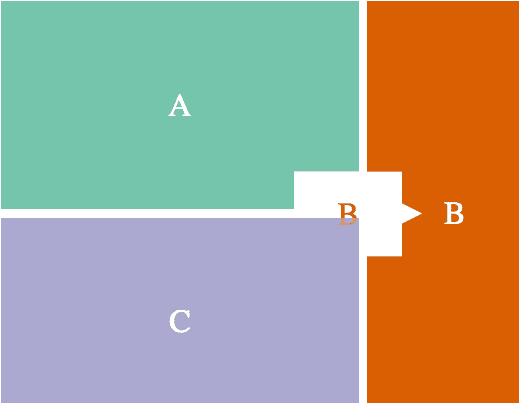 The viewport is divided into 3 adjacent areas, labeled A, B and C and with different background-colors.